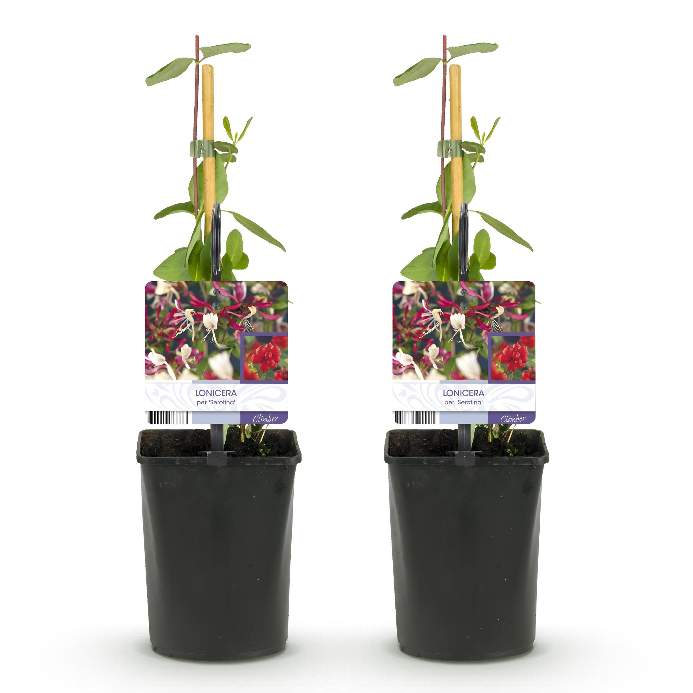 Green boutiQ - Kamperfoelie - Lonicera Serotina - Bloem Roze met Wit - Weinig onderhoud - 2 planten - Pot 11cm Hoogte 40cm