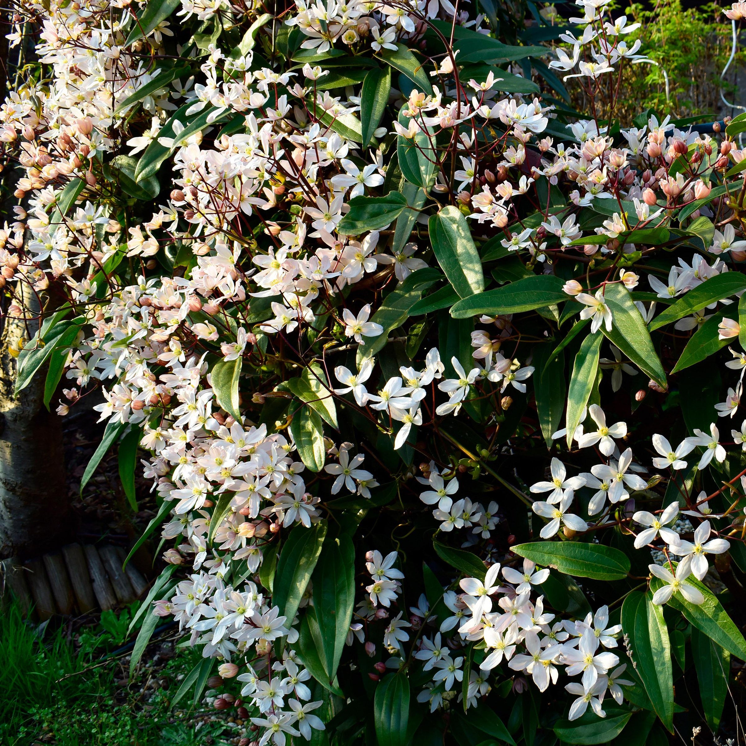De Clematis armandii bloeit in het vroege voorjaar met witte tot romige bloemen die een zoete geur verspreiden. De bladeren zijn glanzend en donkergroen, wat de plant het hele jaar door aantrekkelijk maakt.